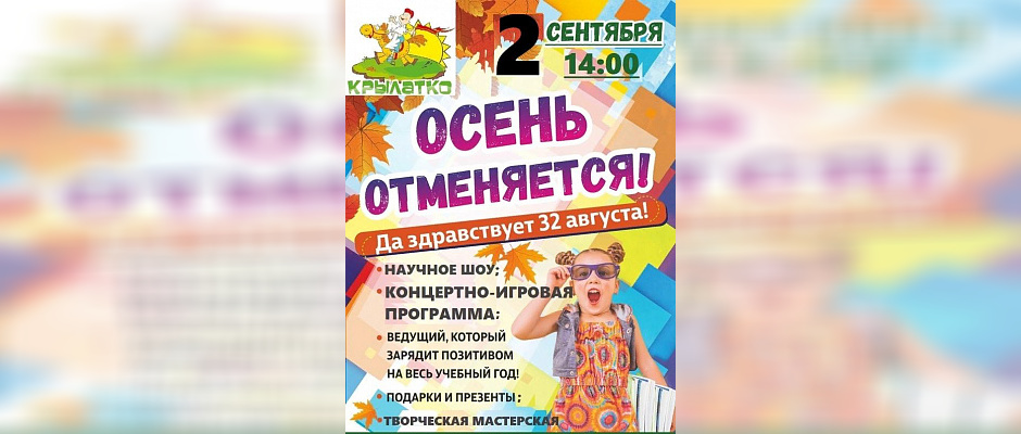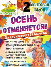 02 сентября в 14:00 всех жителей и гостей Златоуста ждет праздничная программа «Осень отменяется! Да здравствует 32 августа!». В рамках праздничной программы вас ждет: научное шоу, музыкально-танцевальное представление и праздничный концерт творческих коллективов ДК «Булат».