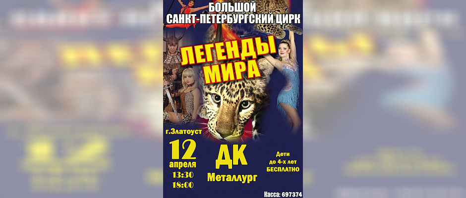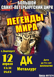 Только 12 апреля в ДК Металлург в 13:30 и 18:00 состоится представление большого Санкт - Петербургского цирка, с программой ЛЕГЕНДЫ МИРА.