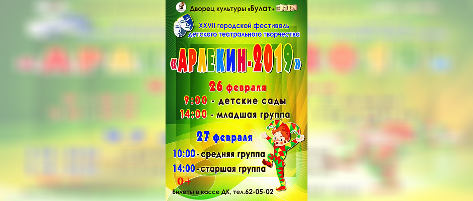 26 и 27 февраля в ДК "Булат" состоится 27 городской фестиваль детского театрального творчества "Арлекин — 2019". В конкурсе примут участие творческие коллективы детских садов города.
