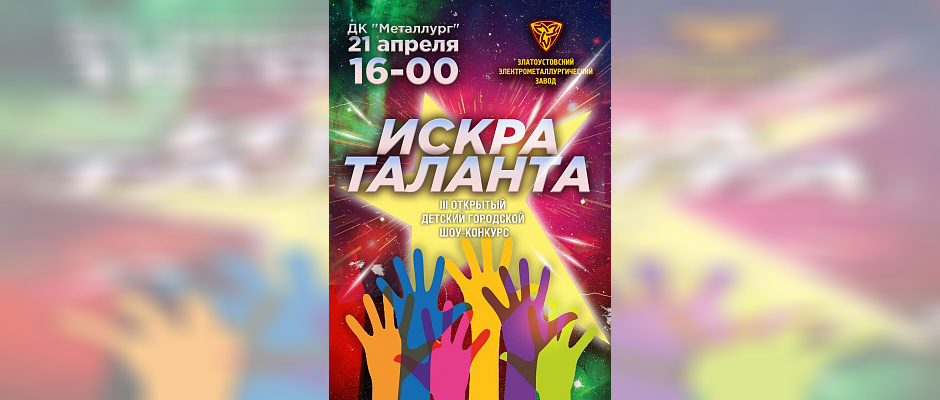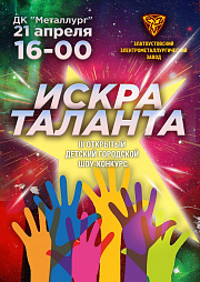 21 апреля в ДК «Металлург» состоится Гала-концерт ежегодного открытого детского городского эстрадного шоу-конкурса «Искра таланта», в котором примут участие коллективы и отдельные исполнители в возрасте от 6 до 16 лет по основным жанрам: вокал (джаз, эстрадный, народный, академический вокал), инструментальный жанр (фортепиано, струнно-смычковые, духовые, народные, эстрадные инструменты), художественное слово (эстрадный монолог, юмористический рассказ, стихотворное произведение), хореография.