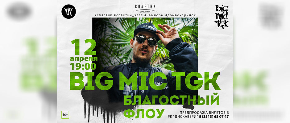 12 апреля, в доме вечеринок "Сплетни" состоится концерт участника группы #ТРИАГРУТРИКА. МИШАНЯ BIG MIC - выступит с новой программой: "Благостный Флоу". Вечер, где "сольются" трэки с грядущего сольного альбома, синглы с альбома "Indiweed" и Ваши любимые куплеты из альбомов Триагрутрики.