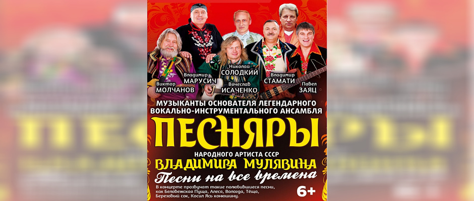 23 февраля 2020 года на сцене Дворца культуры Металлург состоится концерт музыкантов и солистов 90-х народного артиста СССР Владимира Мулявина, основателя вокально-инструментального ансамбля ,,ПЕСНЯРЫ,,.