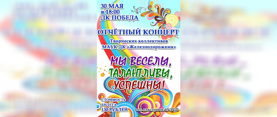 30 мая на сцене ДК Победа представят свой отчетный концерт творческие коллективы ДК "Железнодорожник". Праздник пройдет под лозунгом "Мы веселы, талантливы, успешны!"