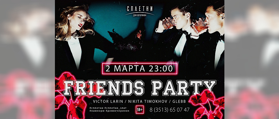 2 марта суббота вторгается большой дружеской тусовкой в Дом вечеринок "Сплетни". По многочисленным просьбам выпивающих и танцующих мы обещаем обогреть, накормить и напоить так, чтобы эта ночь запомнилась надолго. Неприлично "навалят" весеннего баса Victor Larin // Nikita Timokhov // Glebb. И помните, этой ночью дружба будет другой...