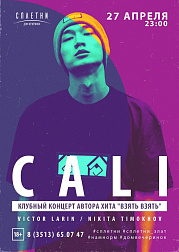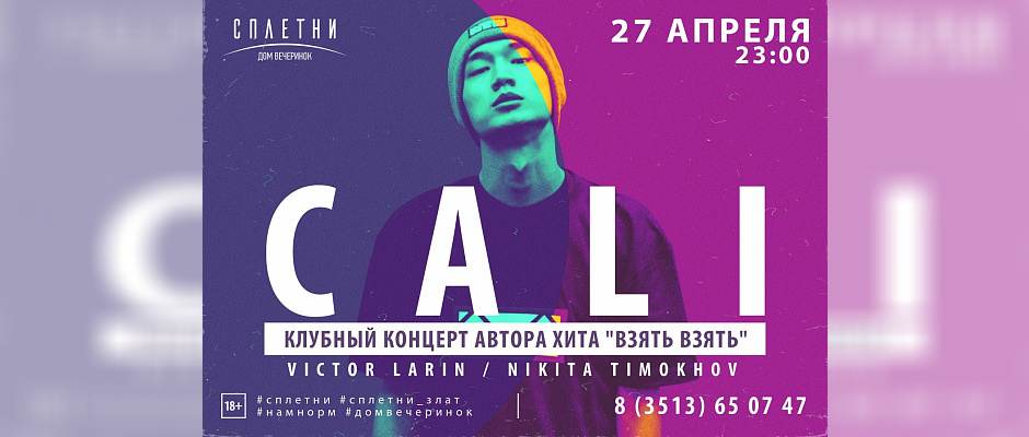 27го апреля, на сцене Дома вечеринок #СПЛЕТНИ с двумя большими концертами выступит представитель новой волны русского рэпа — #CALI. Он приедет со своим клубным шоу, альбомом "Она" и главным хитом "Взять Взять", который стремительно врывается в топы радиостанций, рингтонов и танцполов страны. Поддержат Victor Larin & Nikita Timokhov. Не пропусти громкую тусовку. Количество мест строго ограничено.