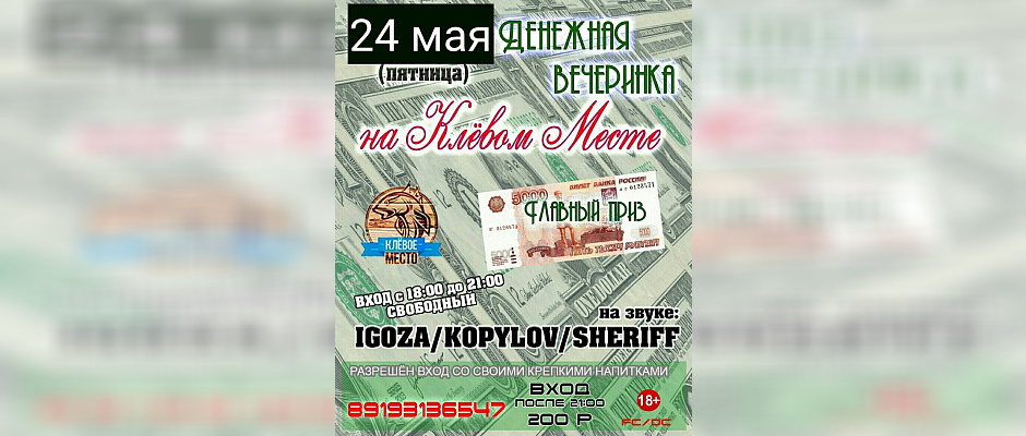 Что может быть лучше подарка? Только подарок деньгами. Стать обладателем кругленькой суммы номиналом в 5000Р можно будет на Денежной вечеринке на Клевом месте в пятницу 24 мая. Старт в 18:00