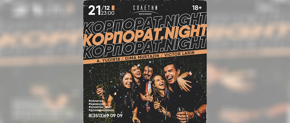 В самые топовые банкетные дни, 20 и 21 декабря, клуб "Сплетни" работает в полном формате на вечеринках "КОРПОРАТ.NIGHT". Уже в эту пятницу и субботу диджеи резиденты, дымные мастера, бармены и офики готовятся раздать Вам отличного настроения и устроить жаркий дэнс.
