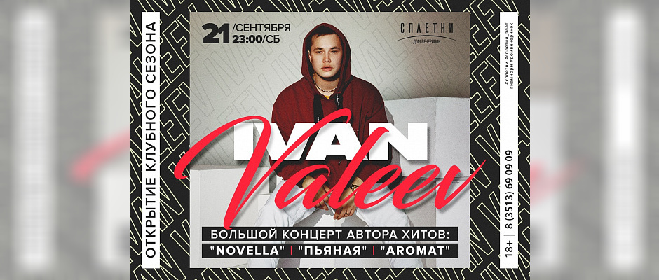 21 сентября открытие новой главы клубной жизни нашего города. Хедлайнер тусовки — хитмейкер IVAN VALEEV. Автор и исполнитель: "NOVELLA", "ПЬЯНАЯ", "AROMAT" и др. Именно он наведет движа и исполнит все главные треки, а также те, которые только готовятся ворваться во все музыкальные чарты страны, на своем клубном концерте в городе Z...! Не пропусти самое ожидаемое событие сентября! Количество мест строго ограничено. Предпродажа билетов с 14.08.19 в РК "Дискавери".