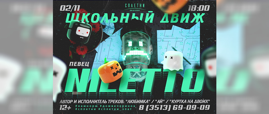 2 ноября в клуб #СПЛЕТНИ состоится школьный движ с певцом NILETTO - участник проекта "Песни" на "ТНТ". Автор и исполнитель треков: «Любимка», «Ай», «Грустный смайлик». Он же самый известный танцор на YouTube, чьи ролики набирают миллионы просмотров. Это крутой концерт и мощнейшая вечеринка в одном.