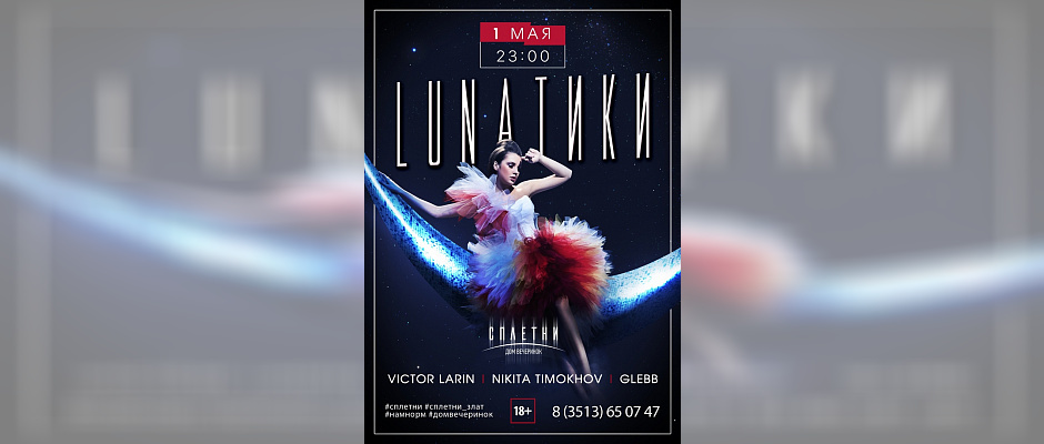 1 мая Дом вечеринок #СПЛЕТНИ ждёт именно тебя на вечеринке #LUNAТИКИ. Будет всё: аудио-прикосновения от Victor Larin / Dima Murtazin / Nikita Timokhov, шоты текилы на баре и дикие танцы.