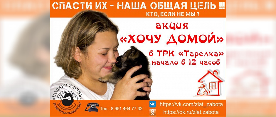 14 сентября, в субботу, состоится акция по пристройству "Хочу домой". Акция по устройству домашних животных в «приемные семьи». Если у вас есть четвероногие, которых нужно пристроить в добрые руки, или вы, наоборот, готовы приютить кошечку-собачку, приходите на акцию в ТРК «Тарелка».