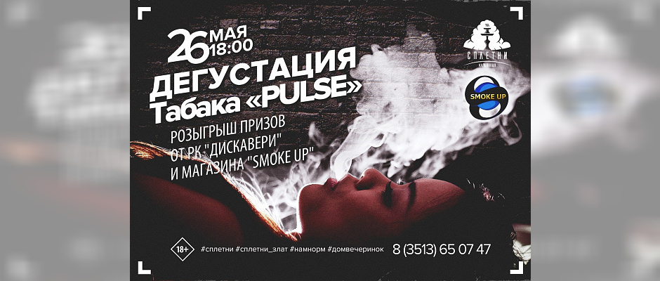 В воскресенье, 26 мая совместно с магазином "SMOKE UP" Дом вечеринок "Сплетни" проведет масштабную дегустацию табака "PULSE". Не упусти шанс абсолютно бесплатно попробовать самые топовые вкусы, поучаствовать в розыгрыше крутых призов и просто насладиться забивками наших кальянщиков. Вход бесплатный.