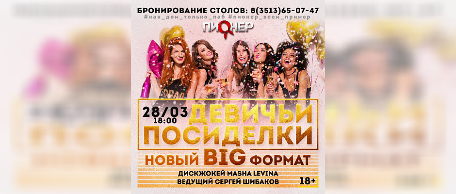 28 марта в пабе "Пионер" мы вновь собираем представительниц прекрасного пола для того, чтобы Вы зажгли на вечеринке "Девичьи Посиделки". За пультом в этот вечер дискжокей Masha Levina, которая в свою очередь подготовит все самое танцевальное, душевное и такое любимое Вами. Ведущий вечера Сергей Шибаков.