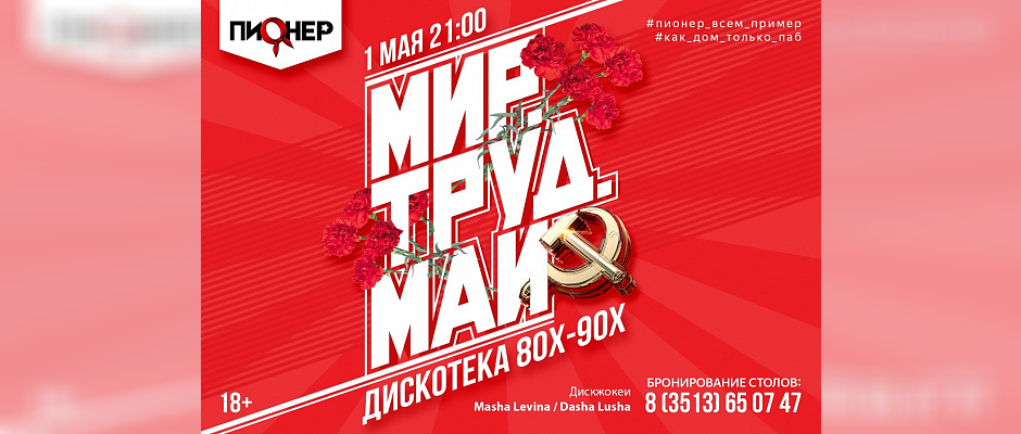 Дворец культуры «Пионер», он же "Паб, для тех, кому немного за..", вновь собирает друзей на Первомайскую ДИСКОТЕКУ 80х-90х под названием "МИР. ТРУД. МАЙ". Если вы помните "Музыка нас связала.." или знаете продолжение текста - "Пусть в твои окна смотрит...", то эта вечеринка для Вас. Музыкальное путешествие в прошлое и ничего лишнего. Только хиты и никаких ремиксов.
