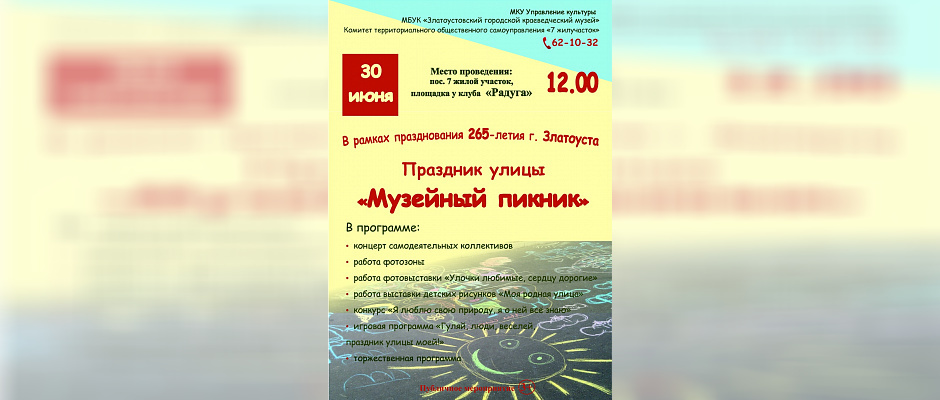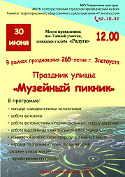30 июня в рамках празднования 265-летия Златоуста городской краеведческий музей проведет праздник улицы "Музейный пикник" на площадке у клуба "Радуга" (7 жил. участок).
