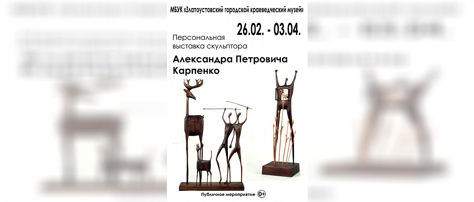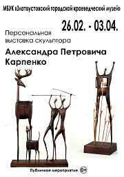 С 26 февраля по 3 апреля в городском краеведческом музее будет представлена выставка талантливого художника, мастера скульптуры Александра Петровича Карпенко. Любимым скульптурным материалом Александра Петровича на протяжении долгих лет остается дерево. Работы художника очень эмоциональны, вызывают улыбку зрителей и заставляют задуматься о жизни. Автор то иронизирует над своими персонажами, то обращается к серьёзным философским проблемам.