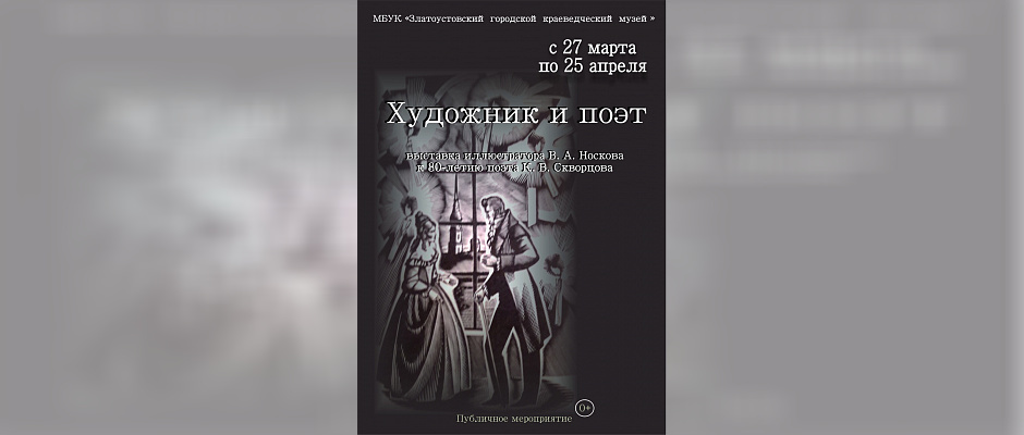 С 27 марта по 25 апреля в городском краеведческом музее будет представлена выставка "Художник и поэт". Выставка представляет работы московского художника-иллюстратора В.А. Носкова к поэтическим произведениям Константина Скворцова. Совместный проект МДПИ «ЛиК» и краеведческого музея, приуроченный к юбилею Почетного гражданина Златоуста К. Скворцова.