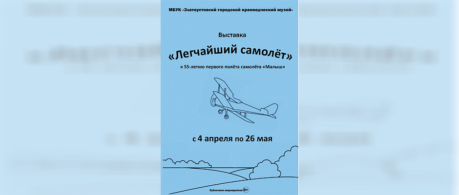 С 4 апреля по 26 мая в городском краеведческом музее будет представлена выставка, посвященная 55-летию первого самолета "Малыш". Этот самолет был построен и впервые запущен в 1964 году златоустовским самоучкой Львом Александровичем Комаровым и его помощниками – мальчишками из авиамодельного кружка, которым он тогда руководил во Дворце пионеров.