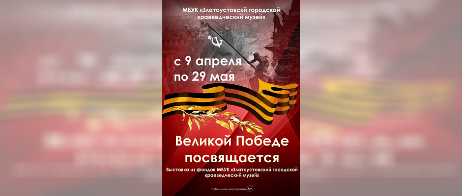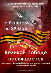 С 9 апреля по 29 мая в городском краеведческом музее будет представлена выставка, приуроченная ко Дню Победы «Великой Победе посвящается…». В годы Великой Отечественной войны на фронт ушли 28 540 златоустовцев, более 6000 не вернулись с поля боя. Величие Победы и горечь утрат в нашей стране коснулись каждой семьи. В 1941 году наши предки встали на защиту Родины плечом к плечу, в один ряд стар и млад, вне зависимости от религиозной и национальной принадлежности.