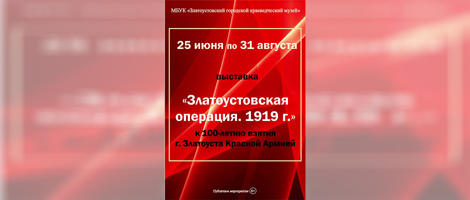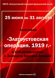 С 25 июня по 31 августа в городском краеведческом музее будет представлена выставка «Златоустовская операция 1919 года». Она посвящена одному из крупнейших сражений на Восточном фронте гражданской войны, и приурочена к 100-летию этого исторического события. Операция, проведённая летом 1919 года войсками 5-й армии, позволила вырывать стратегическую инициативу из рук командования войск адмирала Колчака, и захватить горнозаводскую зону Южного Урала, выведя войска Красной Армии на оперативный простор его степной части. Это направление Восточного фронта было особо важным, поскольку позволяло взять под контроль стратегически важную Самаро-Златоустовскую железную дорогу, продолжением которой являлась Транссибирская магистраль. Осуществление Златоустовской операции позволило командованию Красной Армии продолжить наступление в Зауралье, с выходом в Сибирь, что привело, в конечном итоге к поражению основной силы Белого движения в России – войск верховного правителя России адмирала Колчака, и создало предпосылки для победы большевиков в гражданской войне.