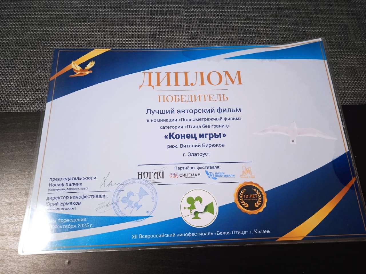 Фильм Виталия Бирюкова «Конец игры» жюри XII Всероссийского кинофестиваля «Белая Птица» отметило в категории «Птица без границ» как самую лучшую авторскую работу.