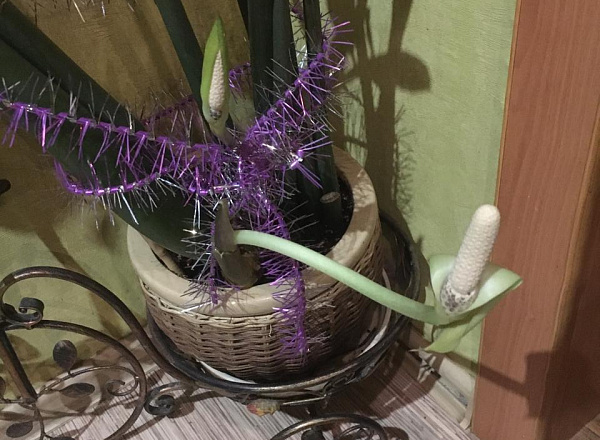 Они выросли совсем рядом, но из плотного кокона, похожего на небольшую зелёную кукурузу, один цветок выбрался быстрее. По примете, замиокулькас (особенно если положить под дно горшка монетку) приносит в дом удачу и финансовое благополучие. Однако цветущее дерево, уверяют адепты всяческих верований, - верный знак, что хозяйка скоро выйдет замуж. Правда, в случае Анны случилась промашка: она уже 20 лет замужем.