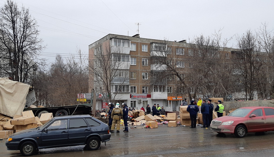 Сейчас на месте аварии работают полицейские, пожарные и медики. На данный момент сведений о пострадавших пока нет, но на снимках видно, что кабина грузовика после удара об опору освещения сильно помята. Как стало известно «Златоуст.инфо», водитель автомобиля успел выскочить из кабины и не получил травм. Кузов фуры разрушен почти полностью, груз – это игрушки - вывалился на дорогу.